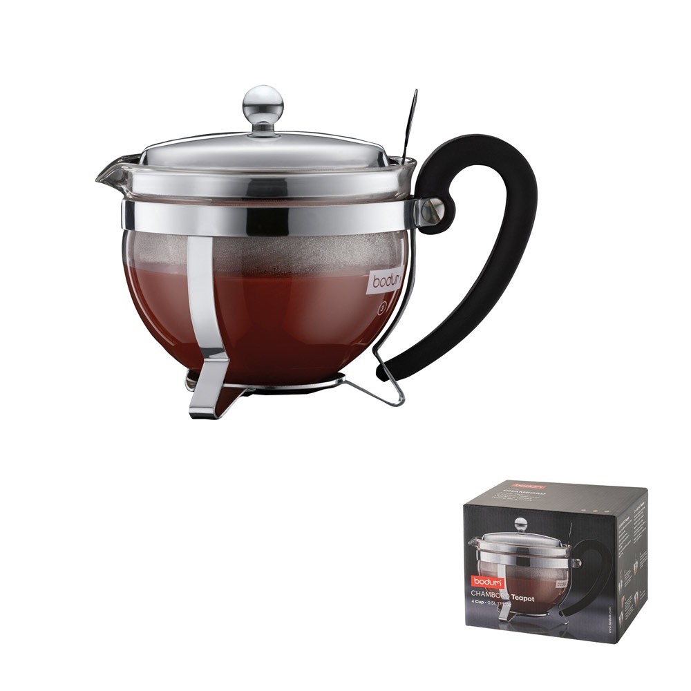 Τσαγιέρα από βοριοπυριτικό γυαλί με εγχυτήρα. Η τσαγιέρα από βοριοπυριτικό γυαλί είναι ανθεκτική στη θερμότητα και δεν αλλοιώνει τη γεύση του ροφήματός σας. Διαθέτει φίλτρο από ανοξείδωτο ατσάλι που επιτρέπει στα φύλλα να αναπτύξουν και να διαδώσουν ακόμα καλύτερα το άρωμά τους. Η τσαγιέρα προστατεύεται από ένα πλαίσιο από ανοξείδωτο χάλυβα για την αποφυγή ατυχημάτων. Διαθέτει επίσης εργονομικό καπάκι και λαβή για μεγαλύτερη ασφάλεια κατά το χειρισμό των ζεστών υγρών. Η τσαγιέρα Chambord είναι ο τέλειος σύμμαχος σας για να φτιάξετε ένα υπέροχο τσάι. Κατάλληλη για πλυντήριο πιάτων. Έχει χωρητικότητα έως και 500 ml. Παραδίδεται σε κουτί δώρου. 185 x 136 x 127 mm