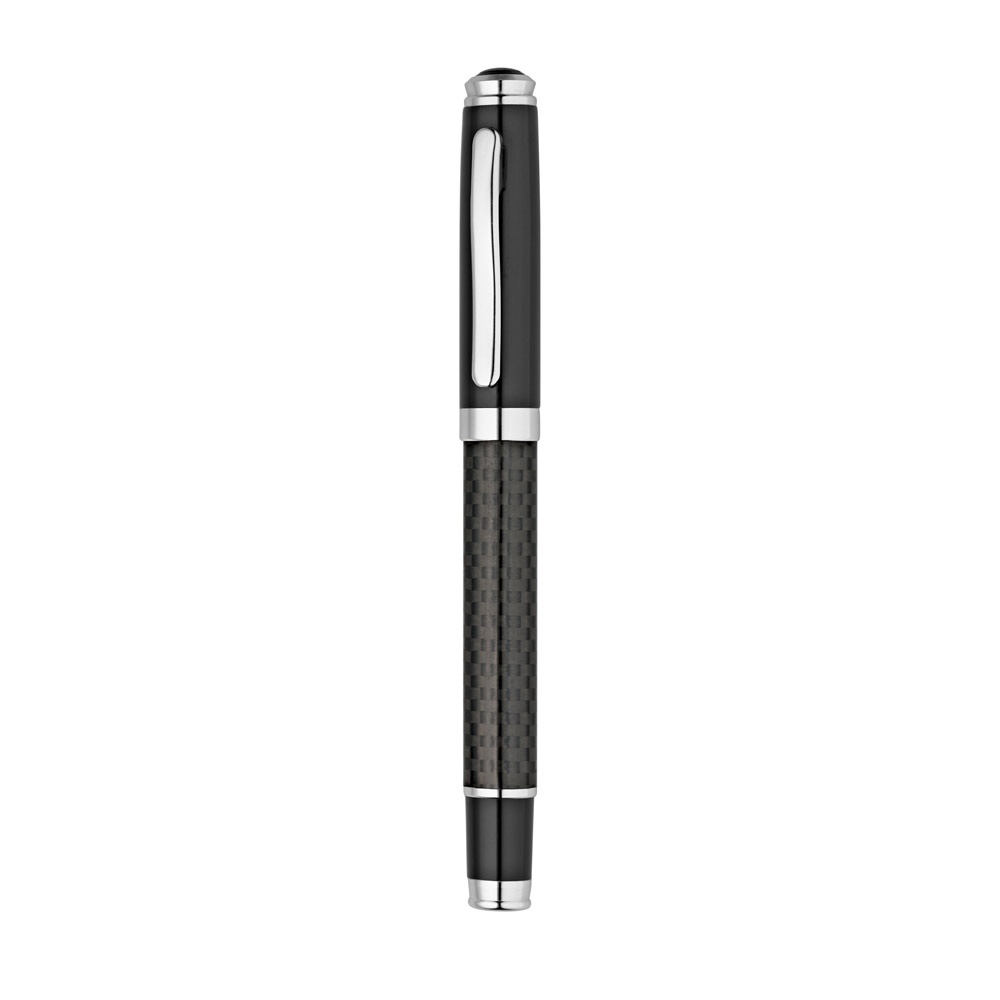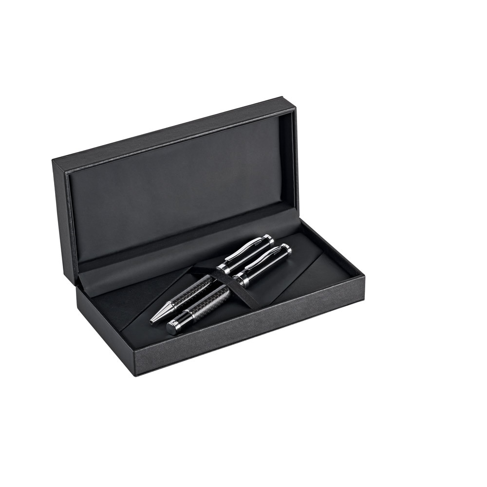 Σετ στυλό κυλίνδρου και ballpoint στυλό από μέταλλο και ανθρακονήματα, και τα δύο με κλιπ. Στυλό με στυλό με μηχανισμό περιστροφής. Μαύρο μελάνι. Παρέχεται σε θήκη απομίμησης δέρματος με επένδυση. ø13 x 139 mm | Κουτί: 195 x 100 x 47 mm