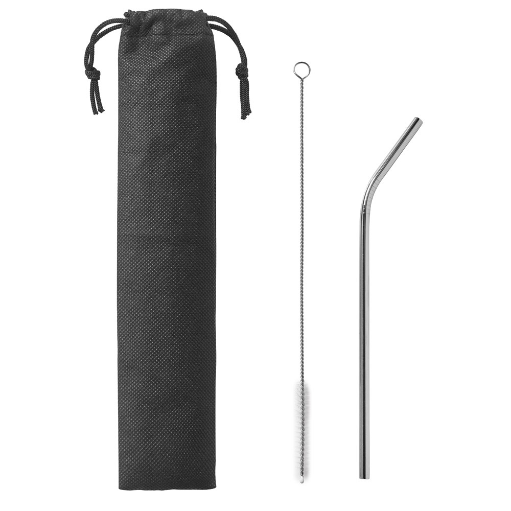 Επαναχρησιμοποιήσιμο κιτ με καλαμάκι από ανοξείδωτο ατσάλι και πινέλο καθαρισμού. Διατίθεται σε μη υφασμένη θήκη (80g/m²) με κορδόνι περίσφιξης. Καλαμάκι: ø6 x 215 mm | Θήκη: 60 x 265 mm