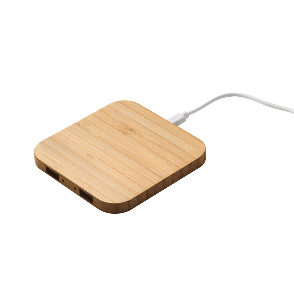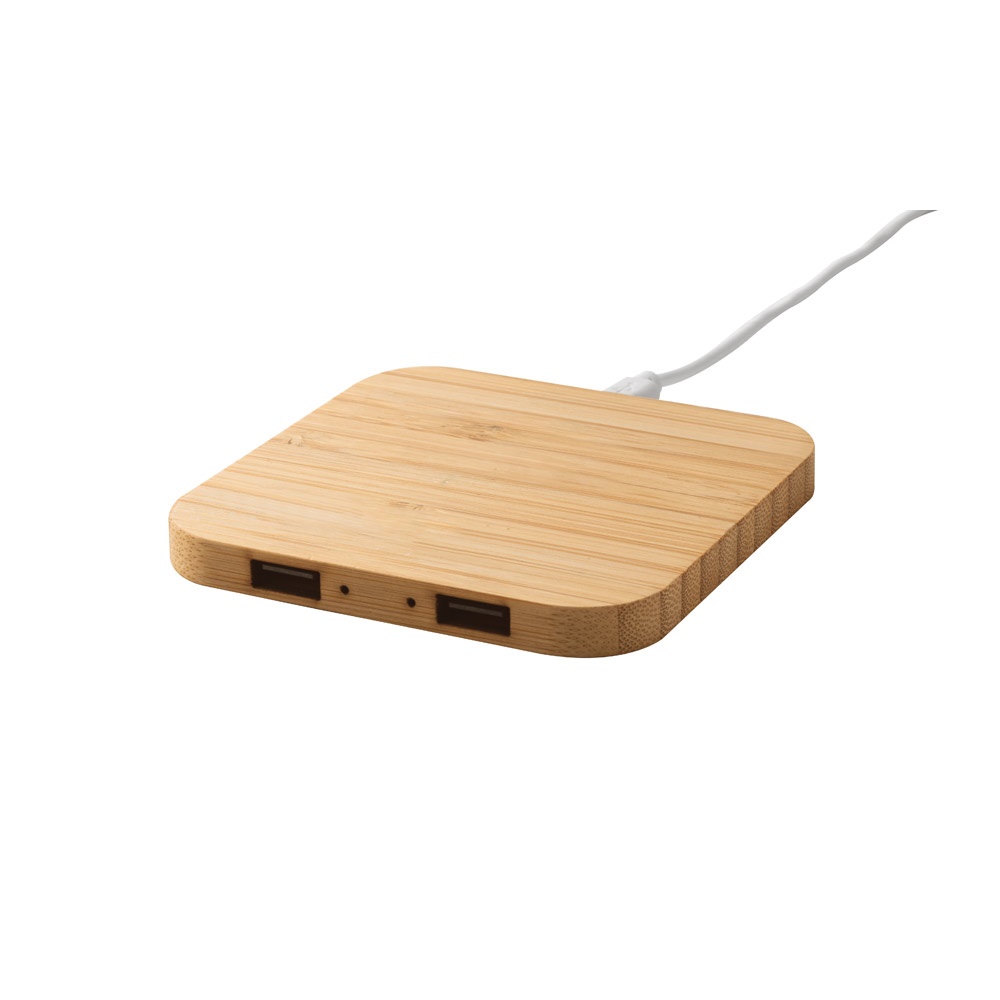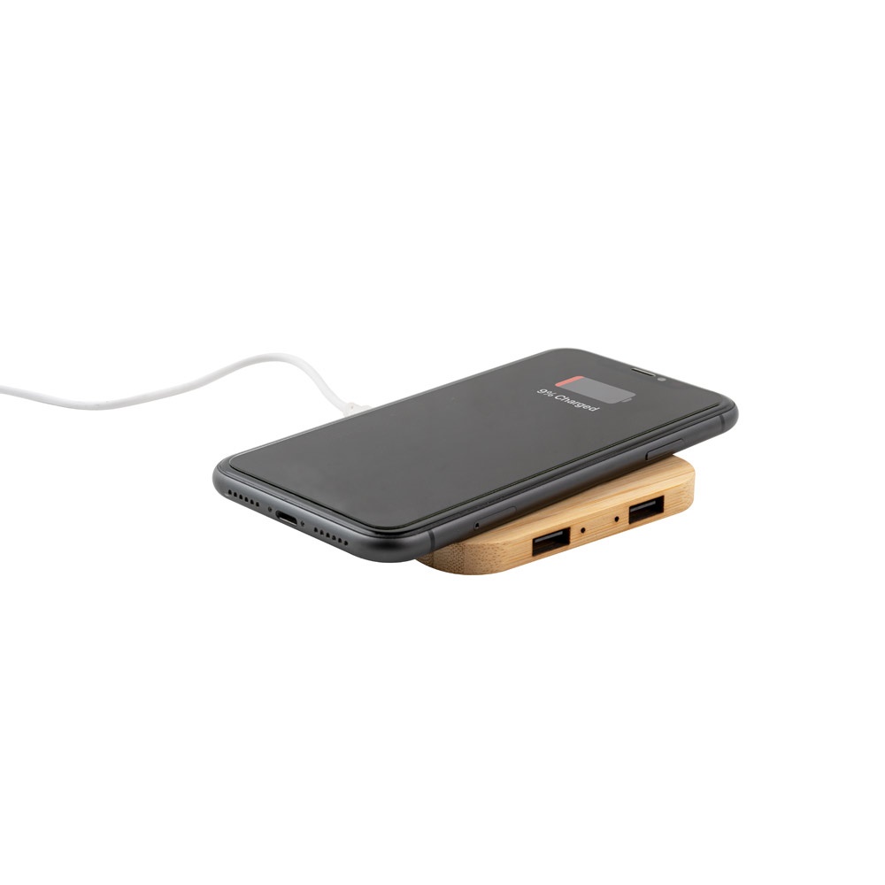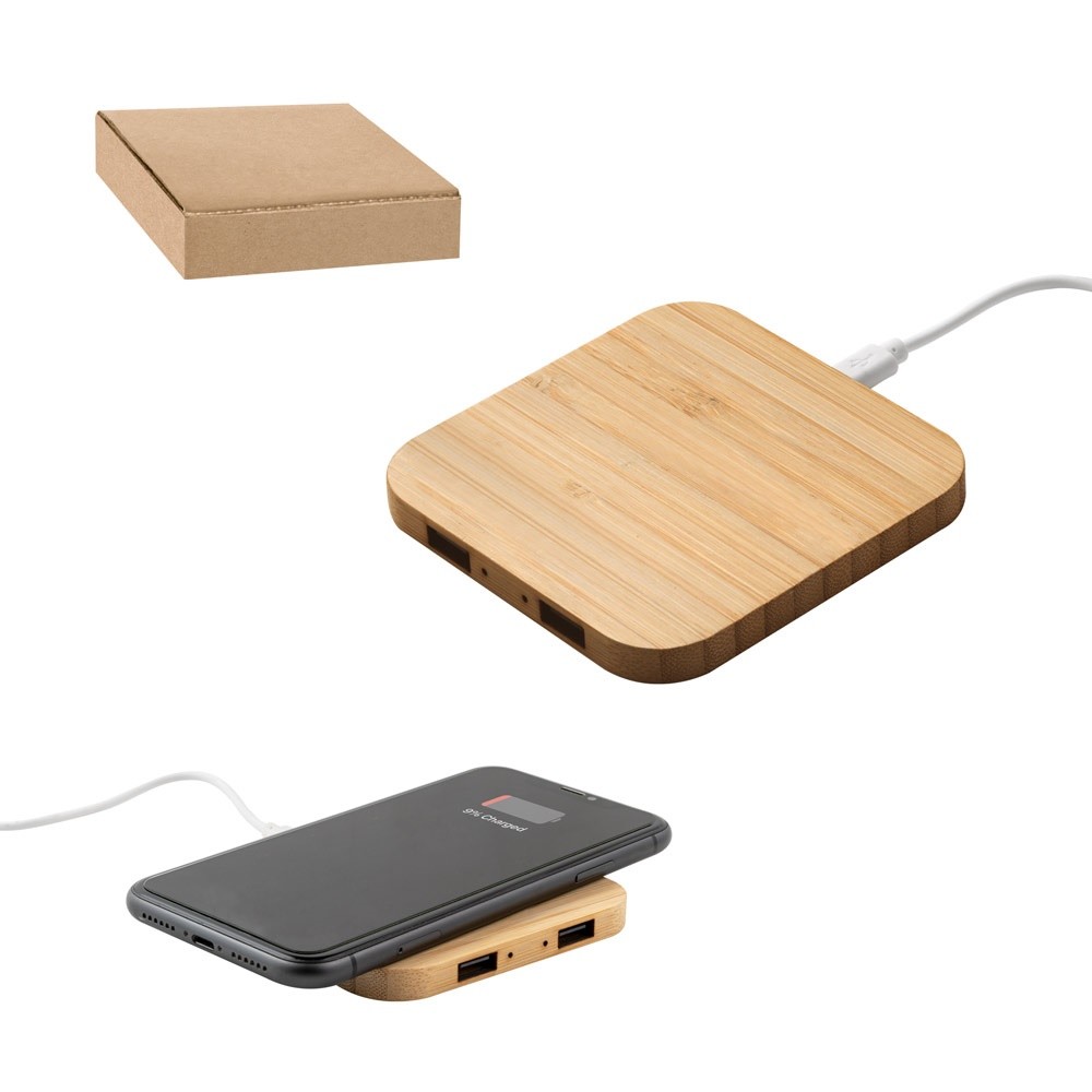 Ασύρματος φορτιστής μπαμπού με λειτουργία κόμβου. Περιέχει 2 εισόδους USB-A και 1 είσοδο micro USB. Έχει ισχύ ασύρματης φόρτισης 10W. Συμβατό με smartphones με τεχνολογία ασύρματης φόρτισης. Περιλαμβάνει καλώδιο 1 μέτρου για φόρτιση. Παραδίδεται σε χάρτινο κουτί δώρου από χαρτί κραφτ. 93 x 93 x 9 mm