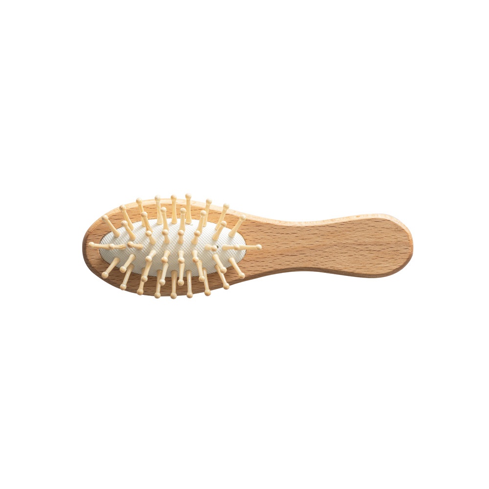 Βούρτσα μαλλιών με ξύλινη λαβή και τρίχες από μπαμπού. Ιδανική για ταξίδια. Παραδίδεται σε χάρτινο κουτί δώρου από χαρτί κραφτ. Βούρτσα: 156 x 43 x 25 mm | Κουτί: 165 x 55 x 35 mm