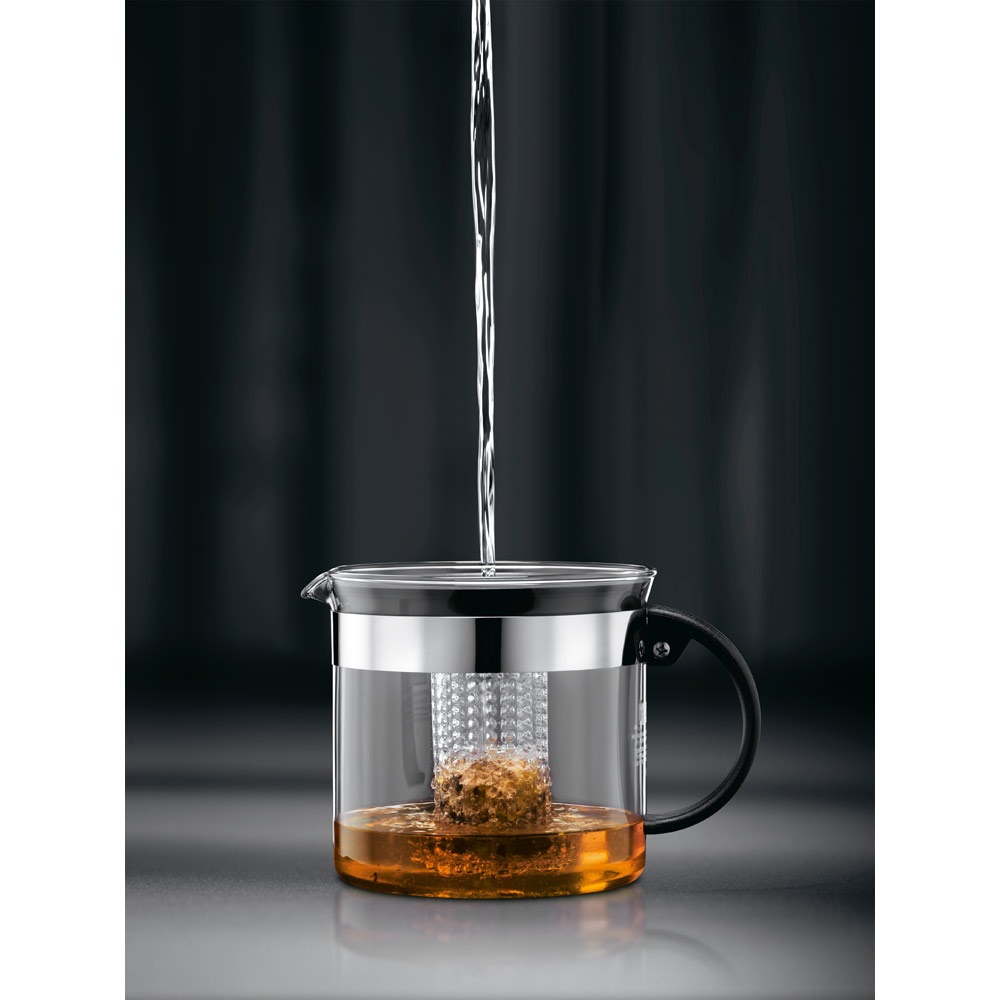 Heat resistant borosilicate glass teapot. It has a large, BPA-free filter (no taste alteration) that gives the tea leaves additional space to develop and dissipate their aroma even better. This brewing process can be interrupted by removing the integrated filter from the kettle. The Bistro Nouveau kettle combines a pleasant design with optimum functionality. It has a capacity of up to 1 L. Made in Europe. Supplied in gift box. 181 x 137 x 134 mm