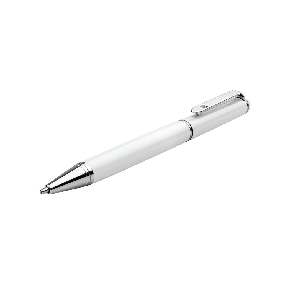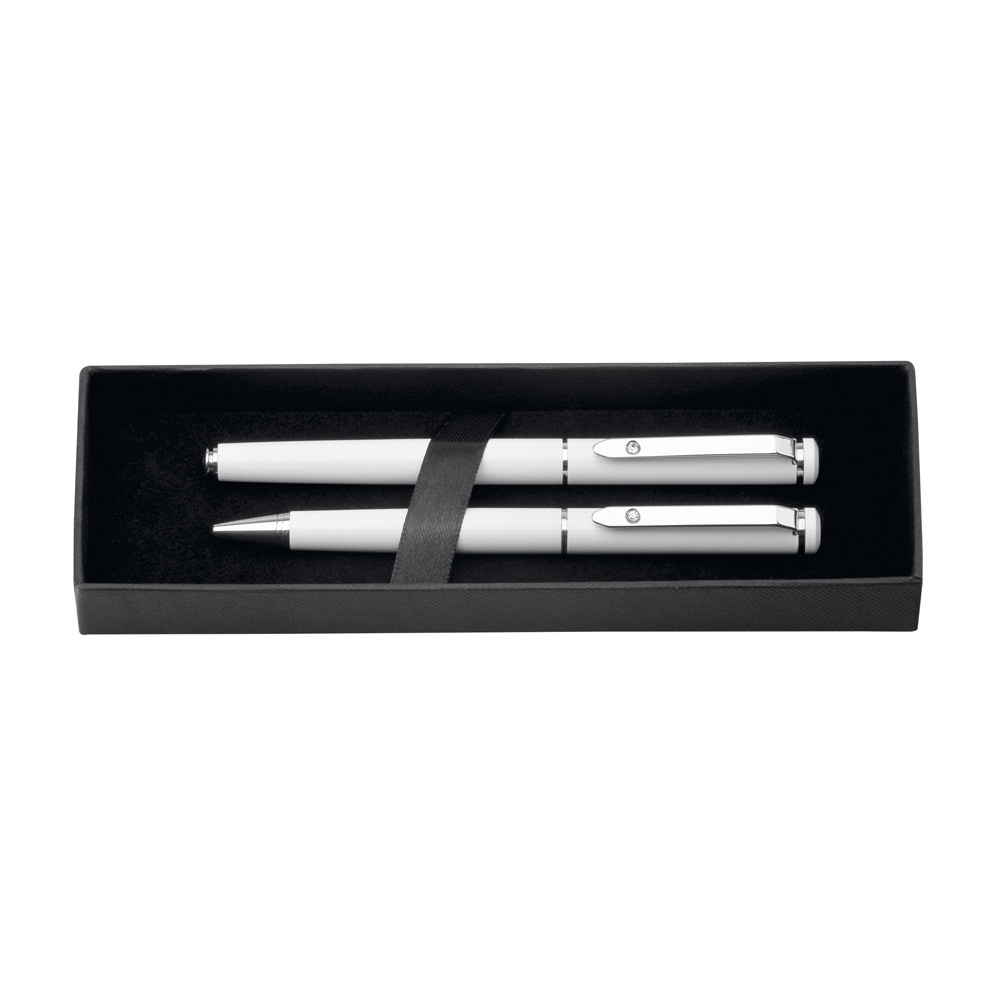 Set with metal ball pen with twist mechanism and rollerball, both with a clip with a sparkling detail at the edge. Supplied in a cushioned gift box. Blue ink. Ball pen: ø10 x 133 mm | Roller: ø10 x 137 mm | Box: 180 x 57 x 25 mm