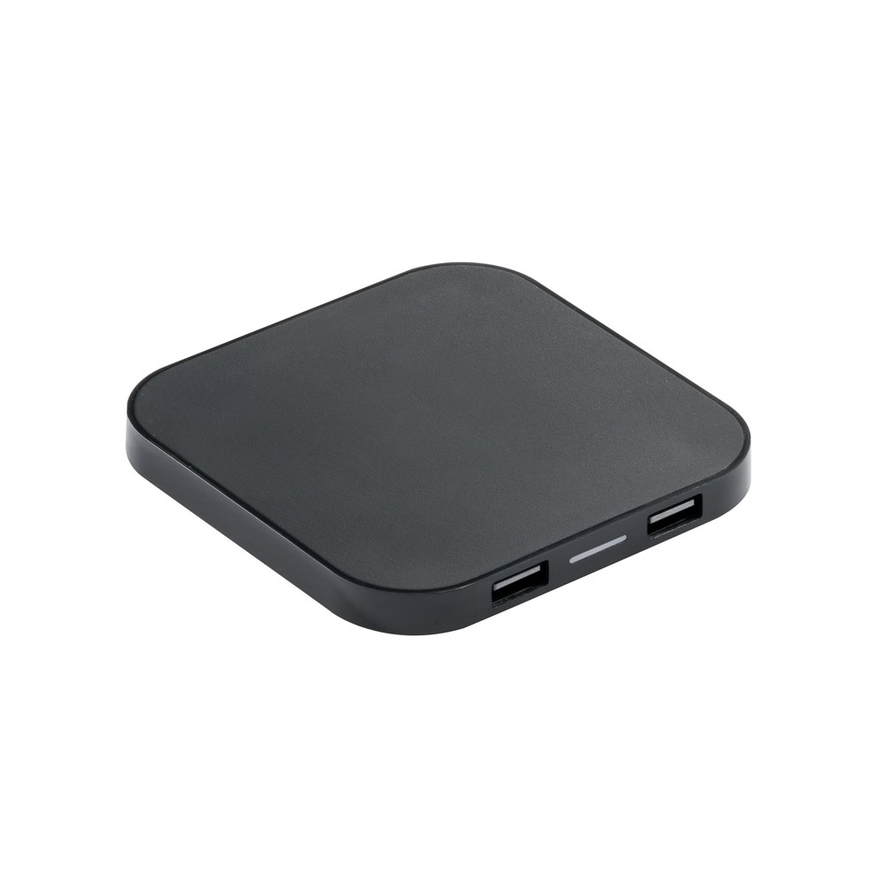 Wireless charger and USB 2'0 hub in ABS. This product allows to charge the device by induction, has 5V/2A input, 5V/0'5-1A output, 2 USB ports and 5W charging power. Includes USB/micro USB cable for charging and is compatible with smartphones with wireless charging technology. 90 x 90 x 10 mm