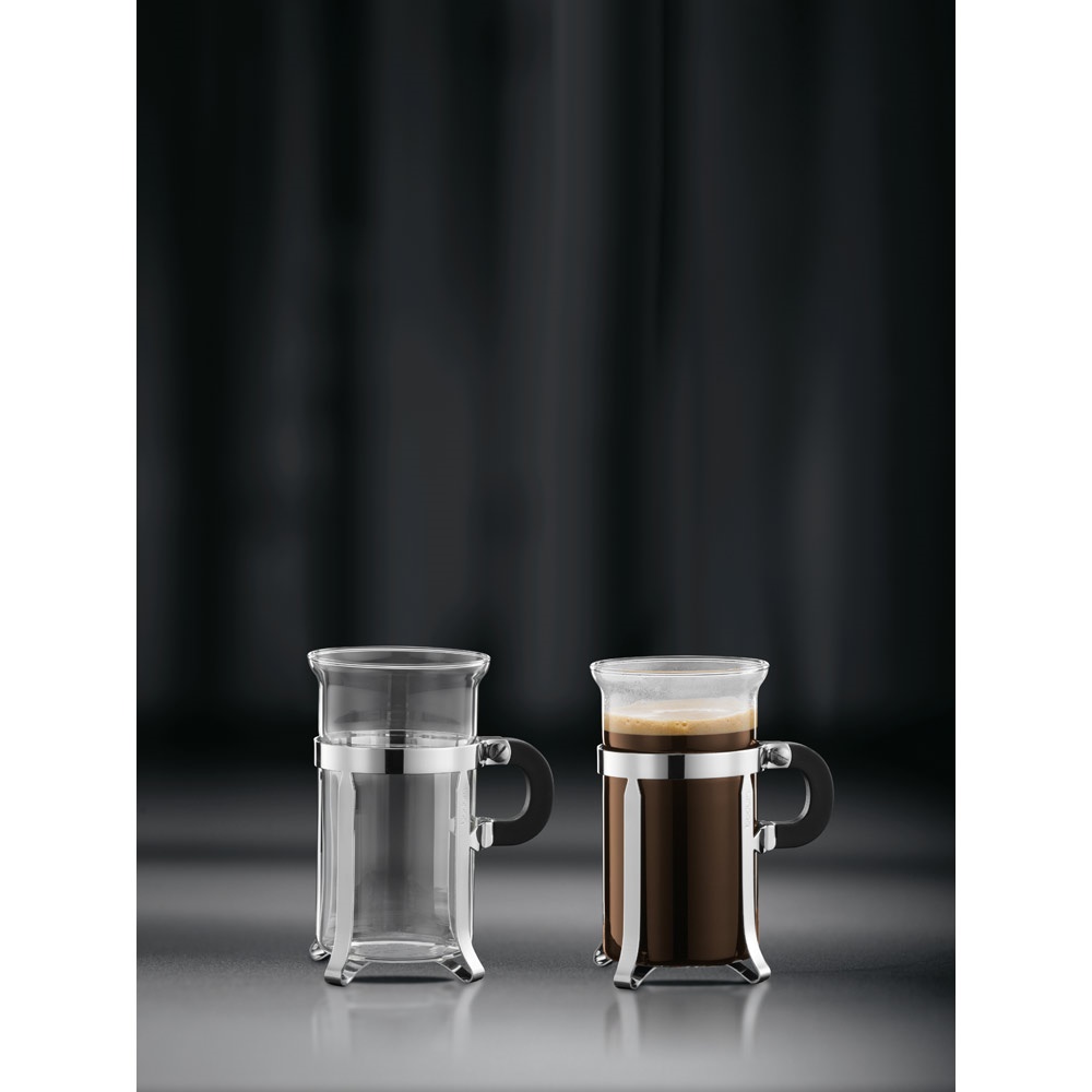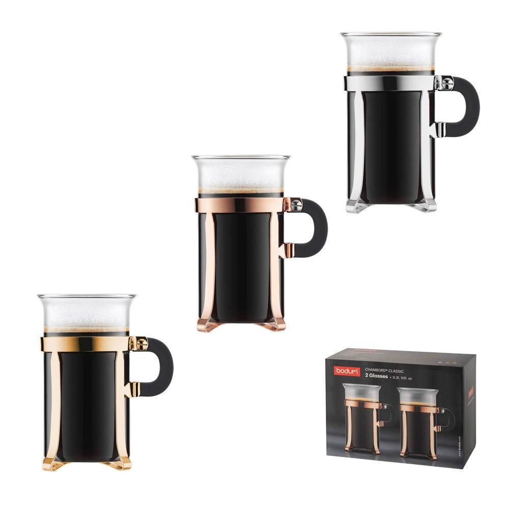 Set of 2 cups made of high-quality borosilicate glass. The glass is heat resistant and does not alter or impair the natural flavour of the beverages. The classic design of the Chambord cups will complement any environment, and sit comfortably alongside your current kettle or coffee maker. It has a capacity of up to 300 mL. Supplied in a gift box. 100 x 130 x 75 mm