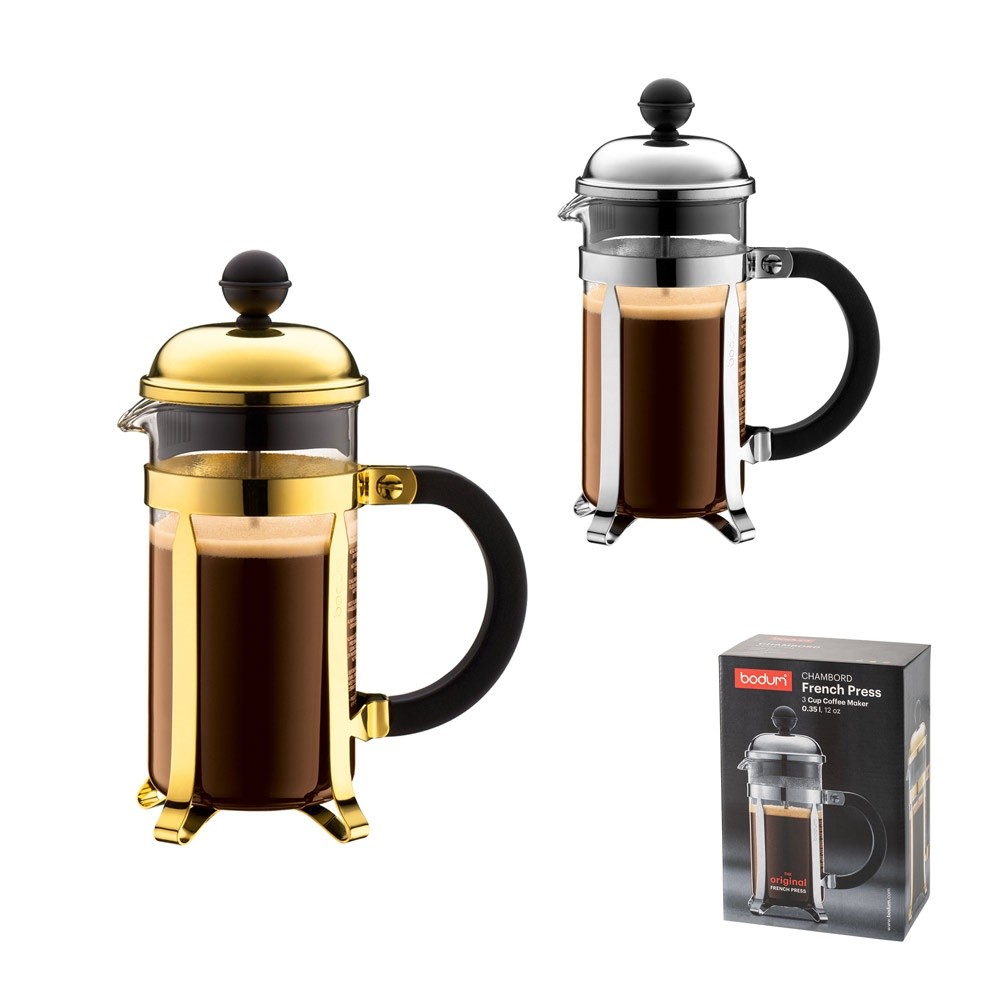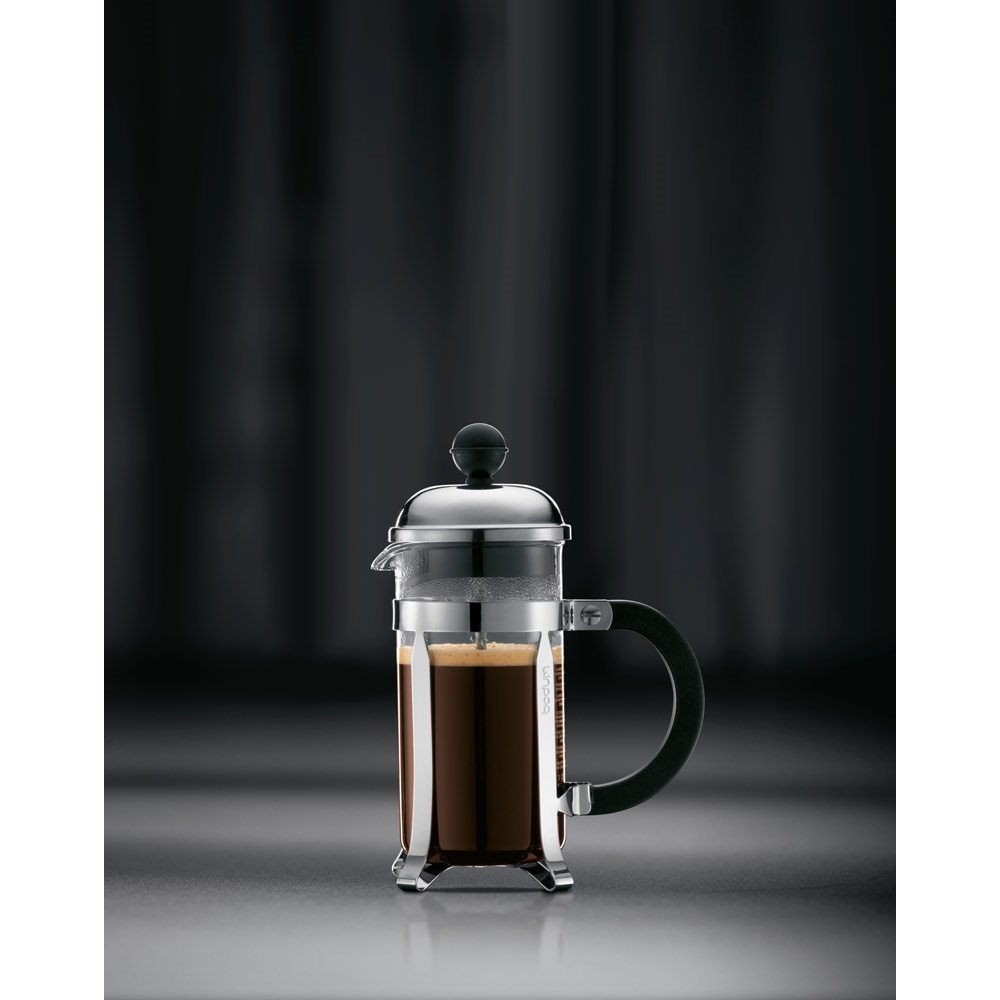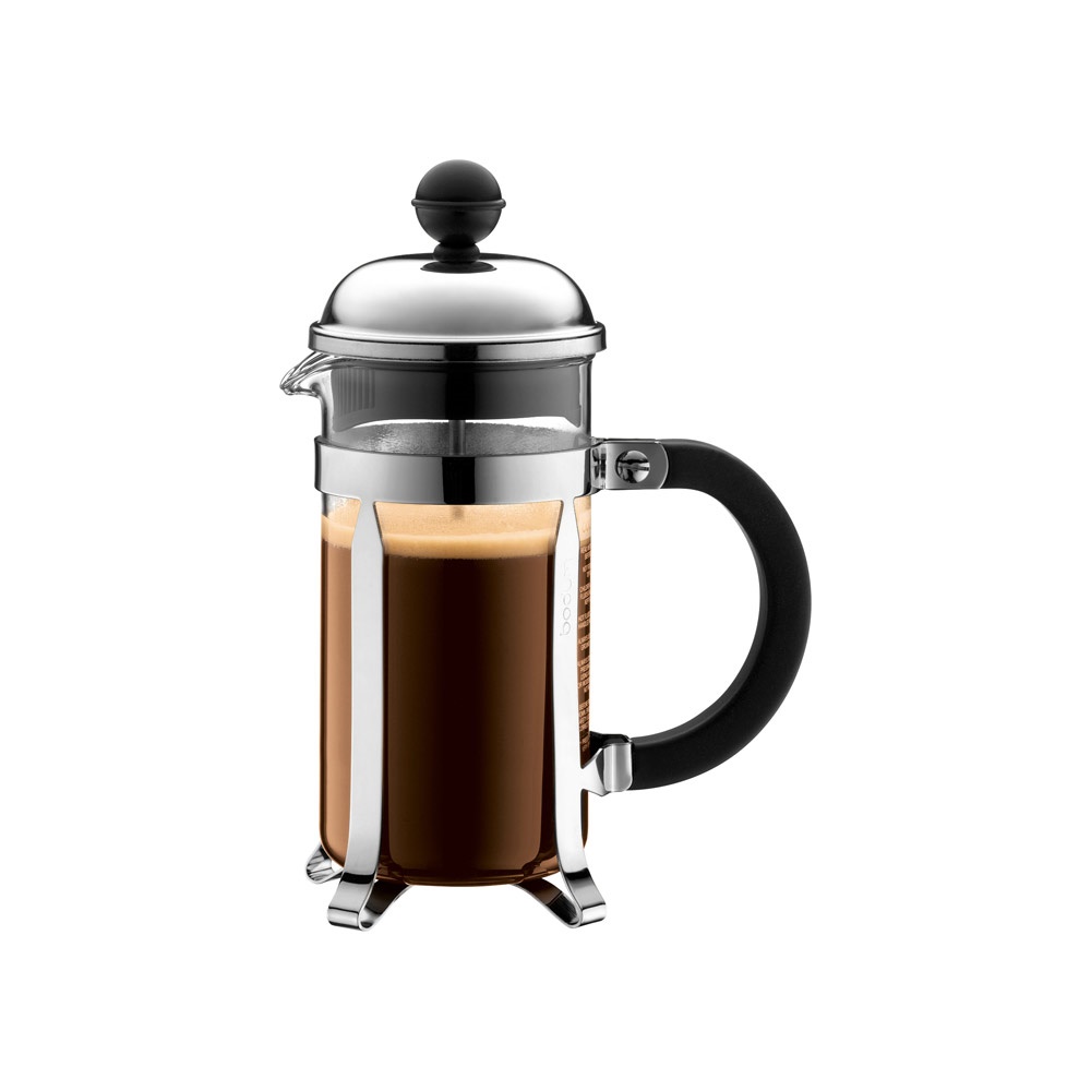 French press coffee maker with a high-quality borosilicate glass container. The glass is heat resistant and does not alter the natural flavour of the coffee. The integral stainless steel plunger prevents the beans from falling out of the coffee maker while the coffee is served. The chrome frame and lid have a durable and attractive shiny finish whilst the PP matte handle provides a comfortable grip which accentuates the quality of the design. The French press system is appreciated by coffee aficionados worldwide for its simplicity of preparation and purity of flavour. The Chambord coffee maker has a timeless design and is produced with the superior craftsmanship its devotees have come to expect. It has a capacity of up to 350 mL. Supplied in a gift box. 111 x 168 x 80 mm