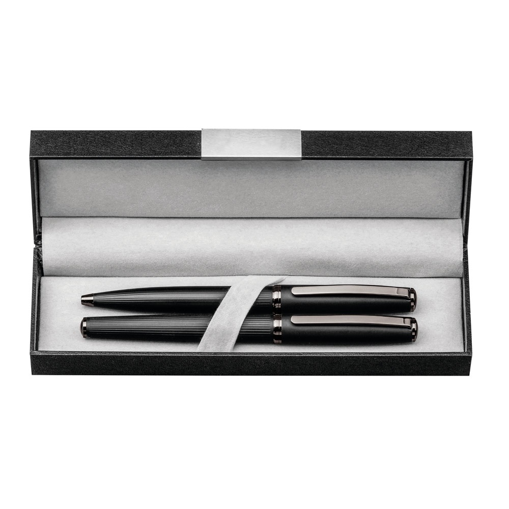 Set with metal ball pen with twist mechanism and rollerball, both with clip. Supplied in a cushioned gift box. Blue ink. Ball pen: ø13 x 137 mm | Roller: ø13 x 137 mm | Box: 180 x 30 x 56 mm