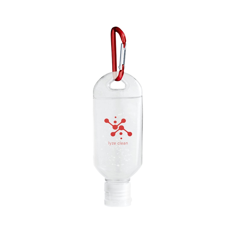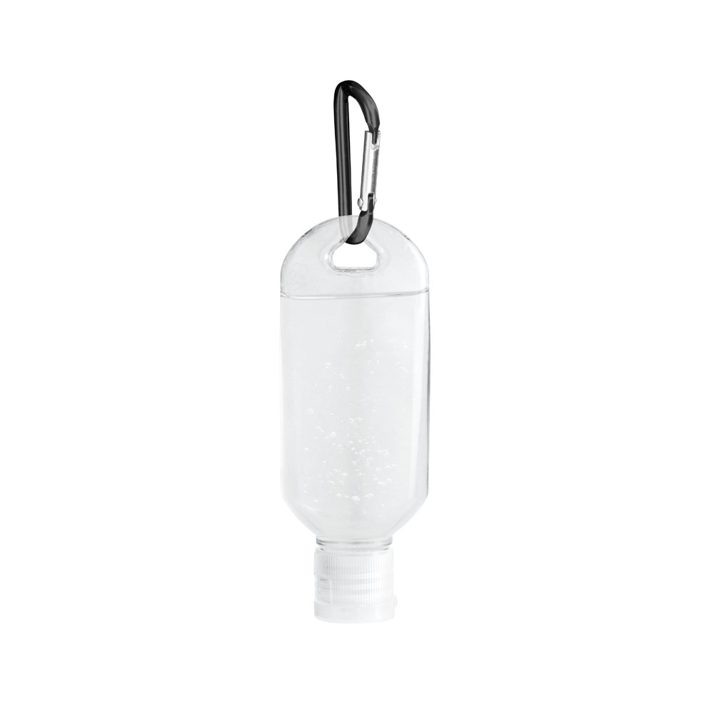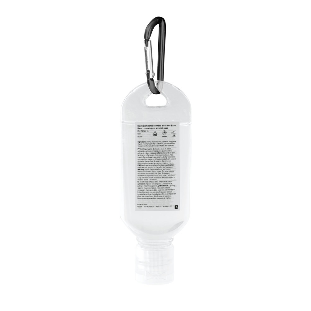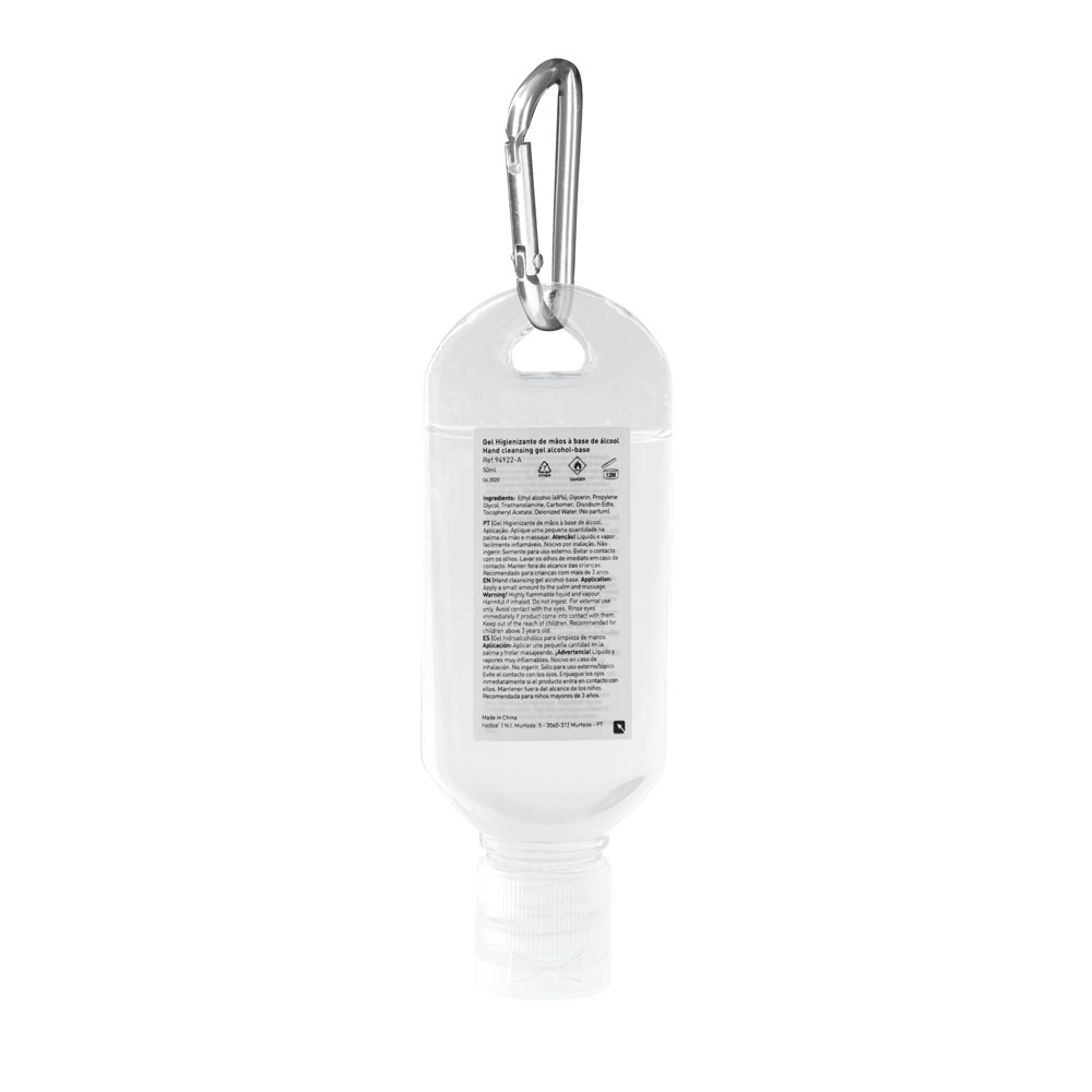 Alcohol-based hand cleansing in 50 ml PETG bottle with flip top cap and carabiner. Formulation with 68% alcohol. Cosmetic product. Practical to take and use anywhere.45 x 120 mm