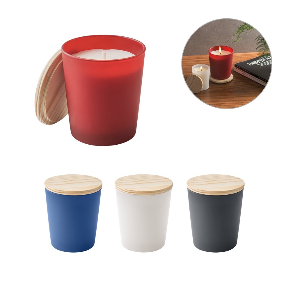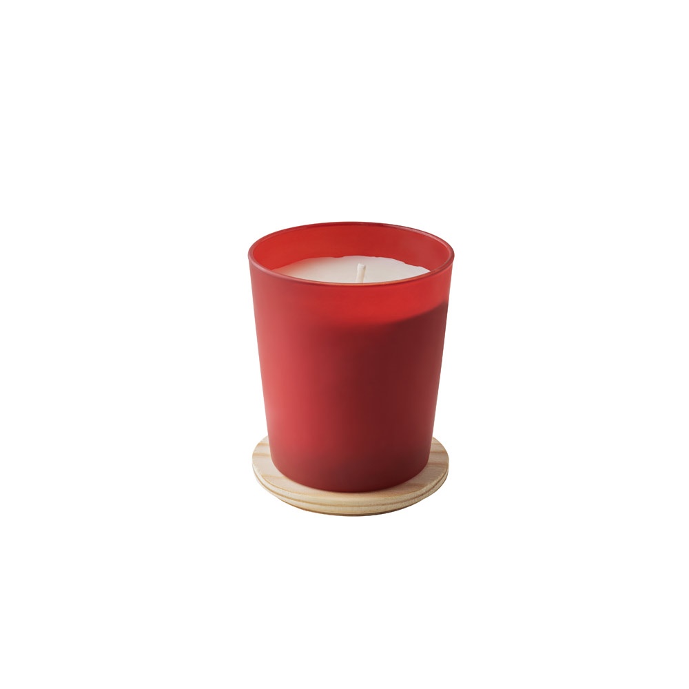 Natural aromatic soy wax candle in a glass cup with a wooden lid. Quantity up to 80g. Supplied in an individual gift box. Made in Europe.Colour 105 - Red berries fragranceColour 104 - Jasmine fragranceColour 106 - Vanilla fragranceColour 133 - Cinnamon and lemon fragrance Ø57 x 69mm