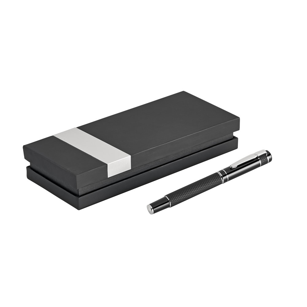 Elegant metal rollerball with cap with clip, and body with imitation leather detail. Supplied in a cushioned gift box. Black ink. ø13 x 141 mm | Case: 180 x 78 x 35 mm