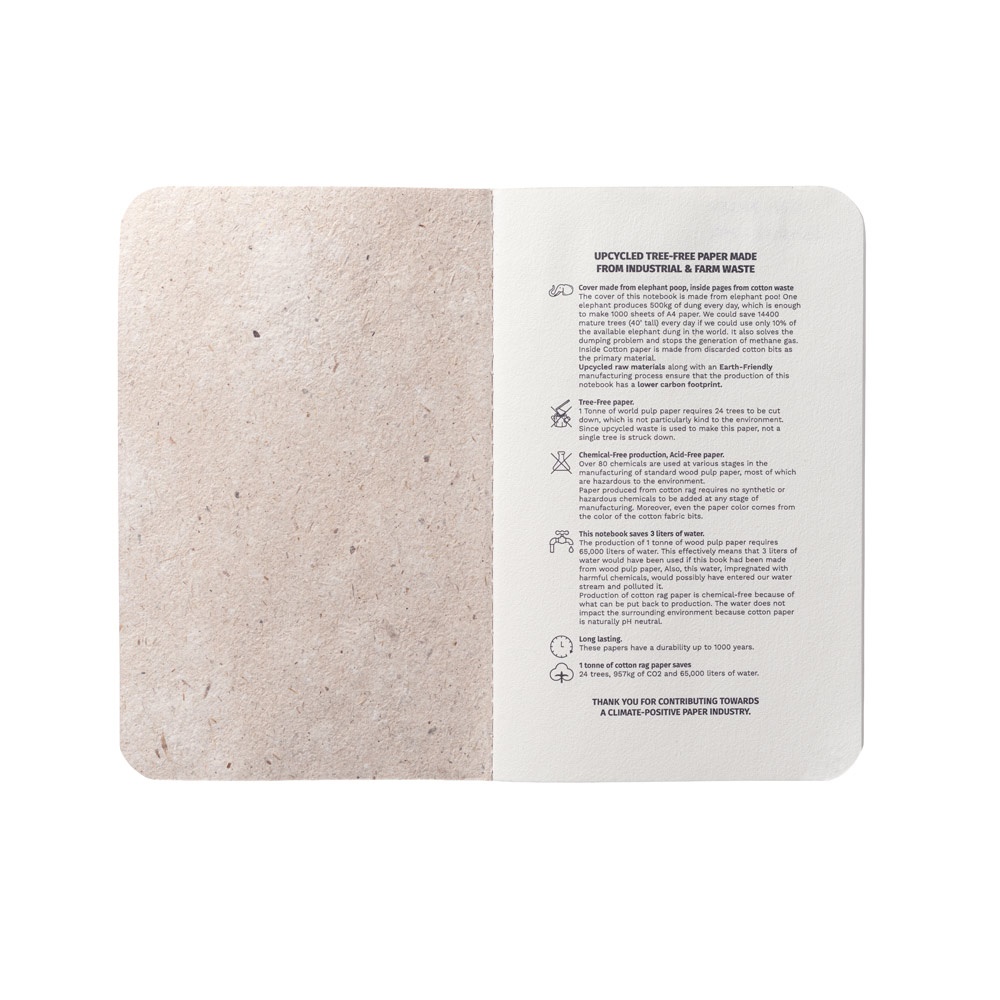 A6 notepad with flexible cover made from organic elephant matter. The inner paper is made from cotton waste and is highly durable. Contains 52 plain pages and paper band with artwork. No waste has been generated nor have any chemicals or trees been used in the manufacturing process of this notepad. 100 x 145 mm