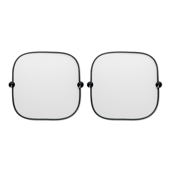 Set of 2 car window shades made of polyester. Includes 2 suction cup holders. Perfect for both winter and summer to keep the weather at bay. This will keep your car cool during the summer by reflecting the sunlight away, and will keep the frost off your windshield when placed on the outside by offering a layer of protection.