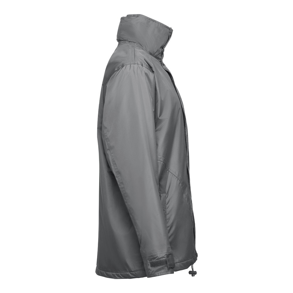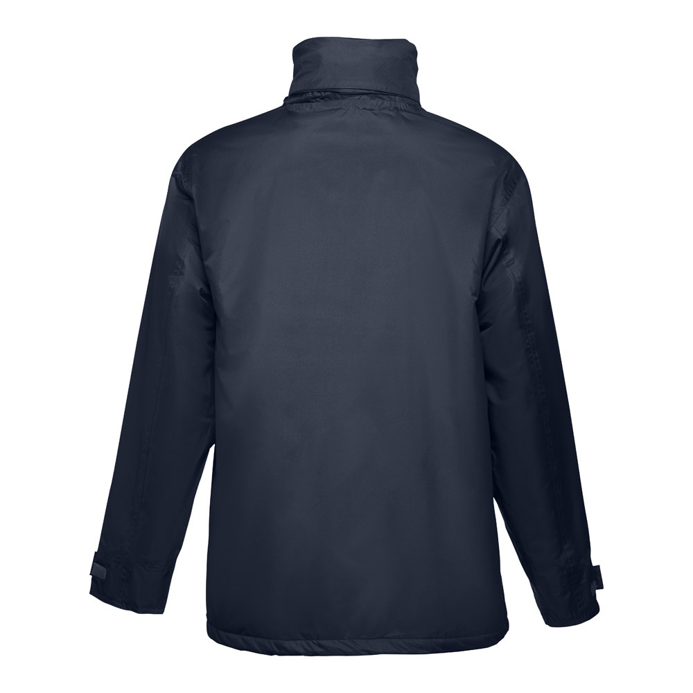 Padded parka (unisex) 100% polyester (exterior: 240 g/m² 100% polyester pongee 240 and waterproof PVC coating, interior: 65 g/m² 100% polyester taffeta, filling: 100% polyester 80 g/m²). Collar lined with black polar mesh (fastened with velcro strip). Foldable collar hood, adjustable with black stoppers. Opening with flap, coloured zip, velcro and snap buttons in black. Contains 2 outer pockets with flap and 2 inner pockets (1 for mobile phone) with velcro closure. Inner 2x2 ribbed mesh cuffs and adjustable outer cuffs with velcro straps. Thermo-sealed seams. Zippered lower back access for easy customisation. Sizes: XS, S, M, L, XL, XXL