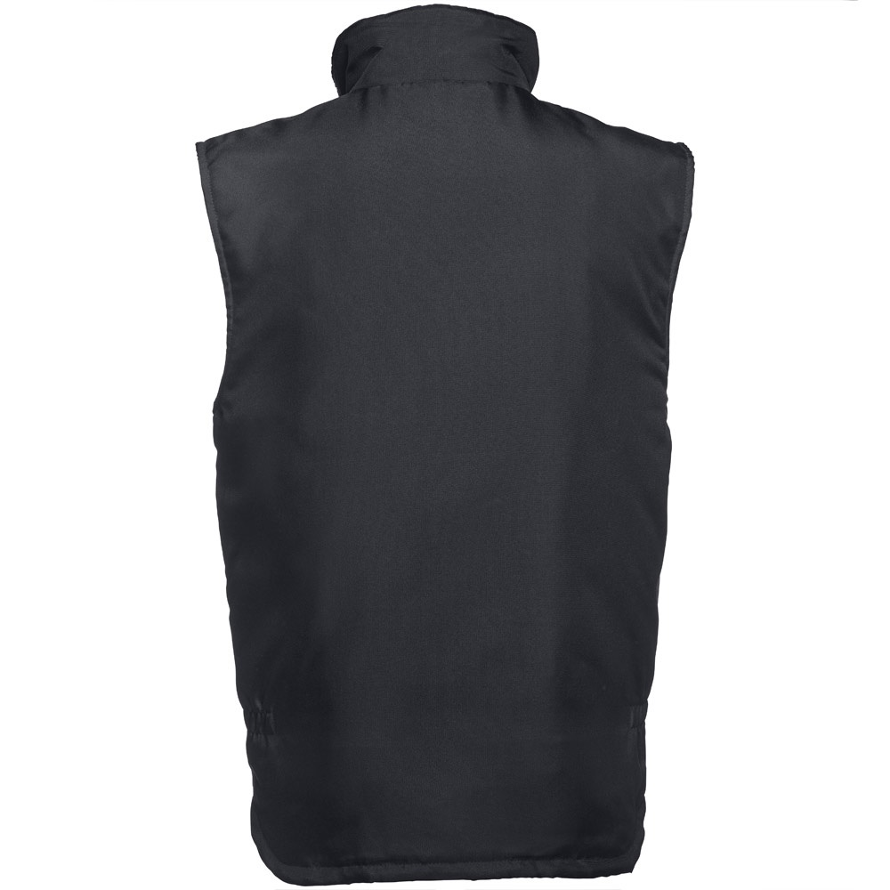Men's padded work vest in 100% oxford polyester with an acrylic coating (170 g/m²), lined in 100% taffeta polyester (65 g/m²). Fleece lined collar and elastic sides for better fit. Contains 6 pockets: 5 front pockets, including 2 with inner zip plus 1 for mobile phone, and 1 inside pocket. Zipped access at the back for easy customisation. Sizes: S, M, L, XL, XXL, 3XL