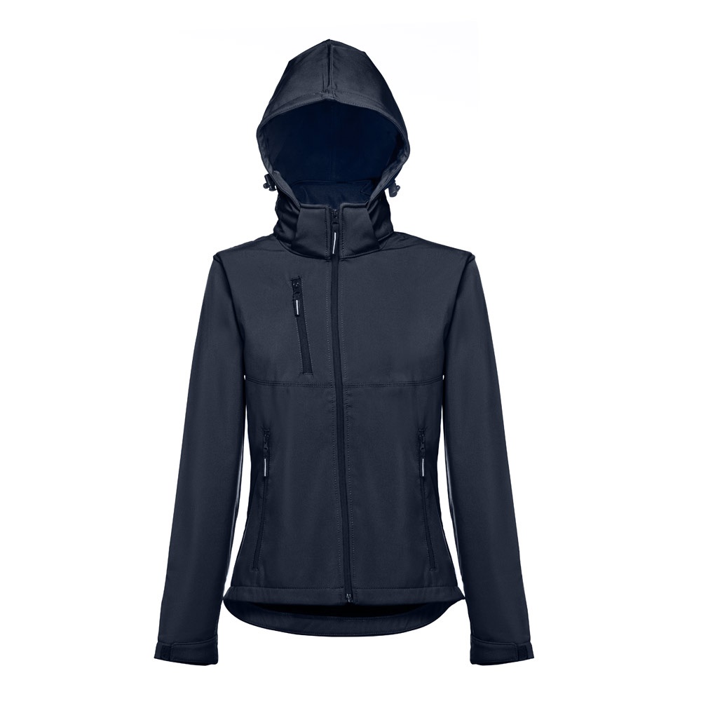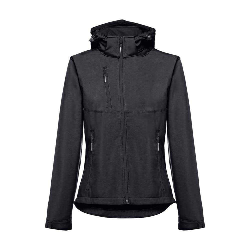 Softshell vest for women in 96% polyester and 4% elastane (280 g/m²), with two layers, removable hood and water resistant coating. Lined jacket with 2 front pockets and diagonal chest pocket, all with zips. Adjustable cuffs with velcro strap. Removable hood with drawstring and Velcro strap to attach to the collar. Rounded hem on the back. Sizes: S, M, L, XL, XXL