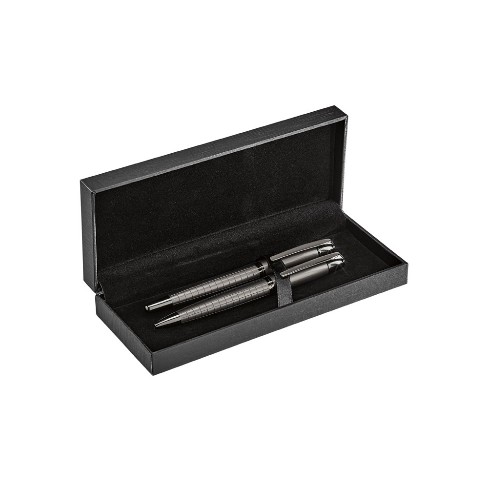 Σετ με μεταλλικό ρόλερ και στυλό. Το ρόλερ γράφει με μαύρο χρώμα και το στυλό με μηχανισμό περιστροφής γράφει με μπλε χρώμα. Παρέχεται σε μια συσκευασία δώρου με επένδυση. ø13 x 135 mm | Κουτί: 185 x 75 x 31 mm