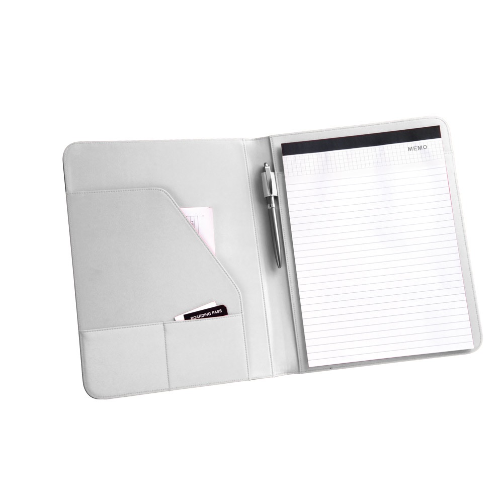Φάκελος Α4 απομίμησης δέρματος και 800D με εσωτερικό μικροϊνών. Ο φάκελος περιέχει ένα λαστιχο για κλείσιμο, σημειωματάριο με επ'ενδυση 20 φύλλων , 3 τσέπες και μια θήκη για στυλό (δεν περιλαμβάνεται το στυλό). 245 x 315 x 15 mm