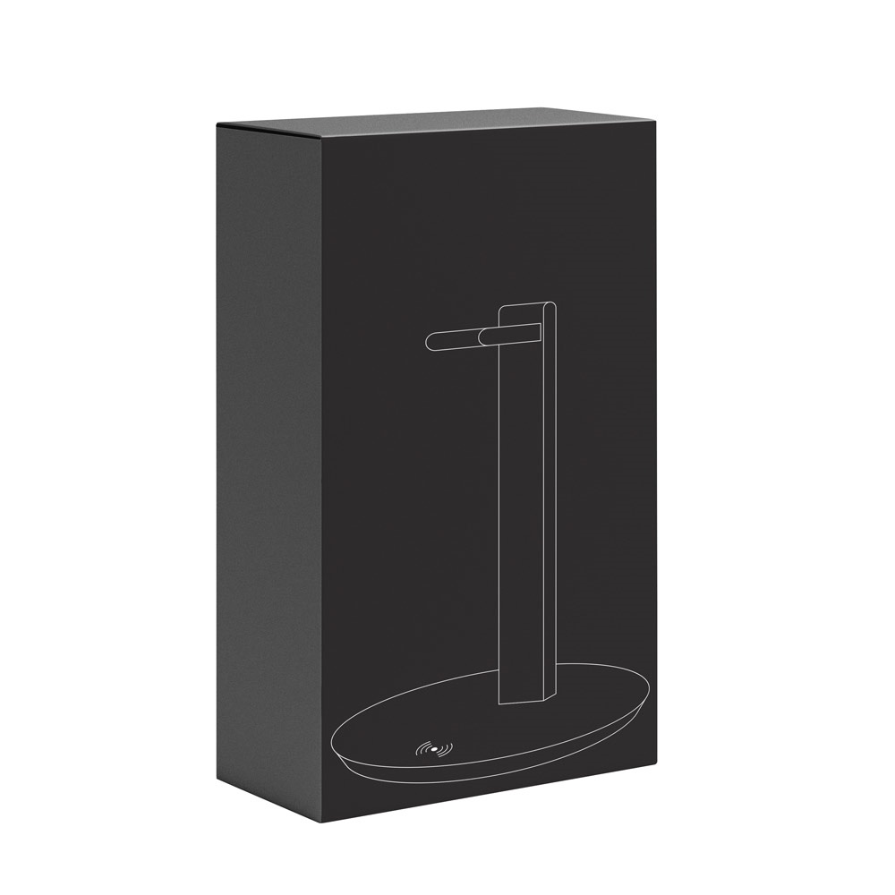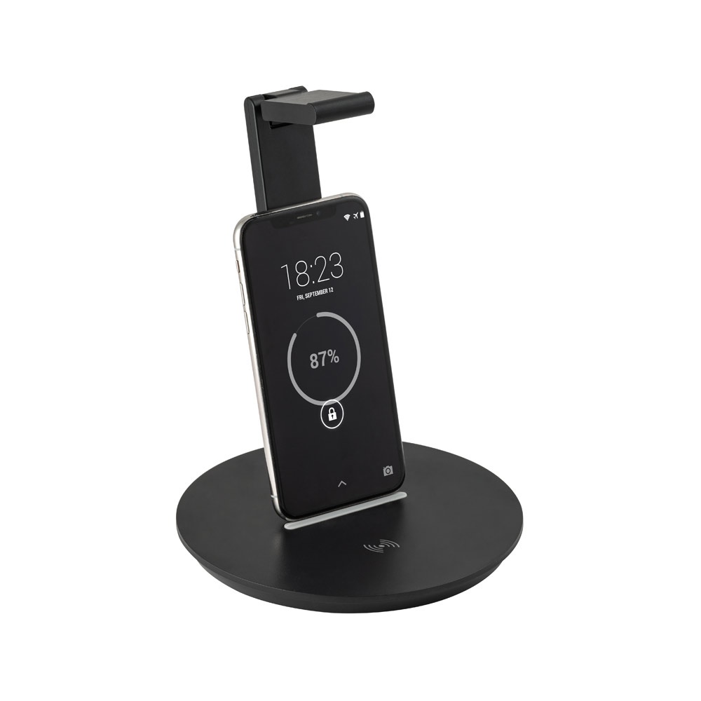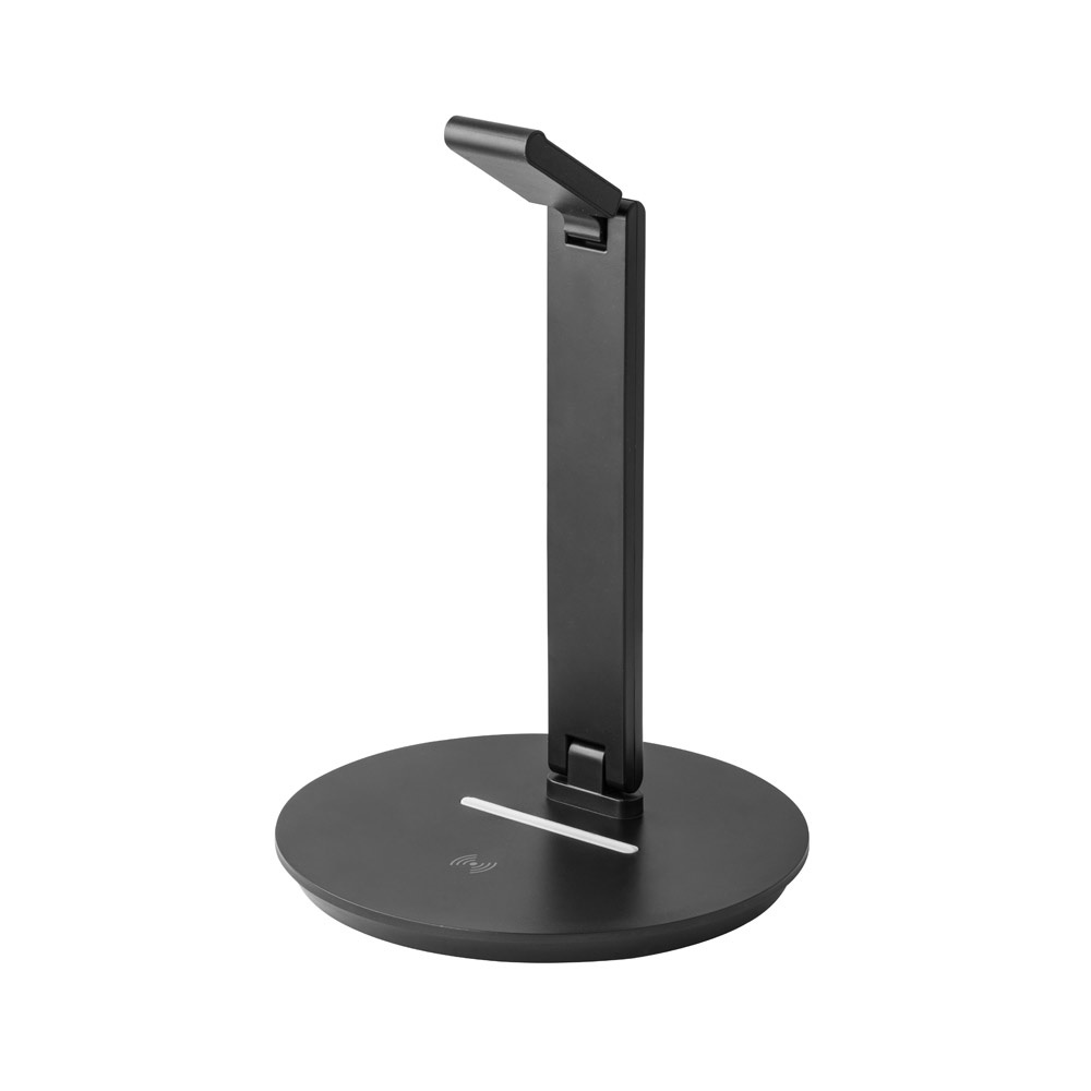 ABS βάση ακουστικών με ενσωματωμένο ασύρματο φορτιστή. Ισχύς 10W, καλώδιο 1m USB σε USB-C. Είσοδος USB-C με 5V/2A ή 9V/1'1A και ασύρματη έξοδο με 5V/1A ή 9V/1'1A. Διατίθεται σε μαύρο κουτί δώρου. ø160 x 257 mm | Κουτί: 175 x 47 x 344 mm