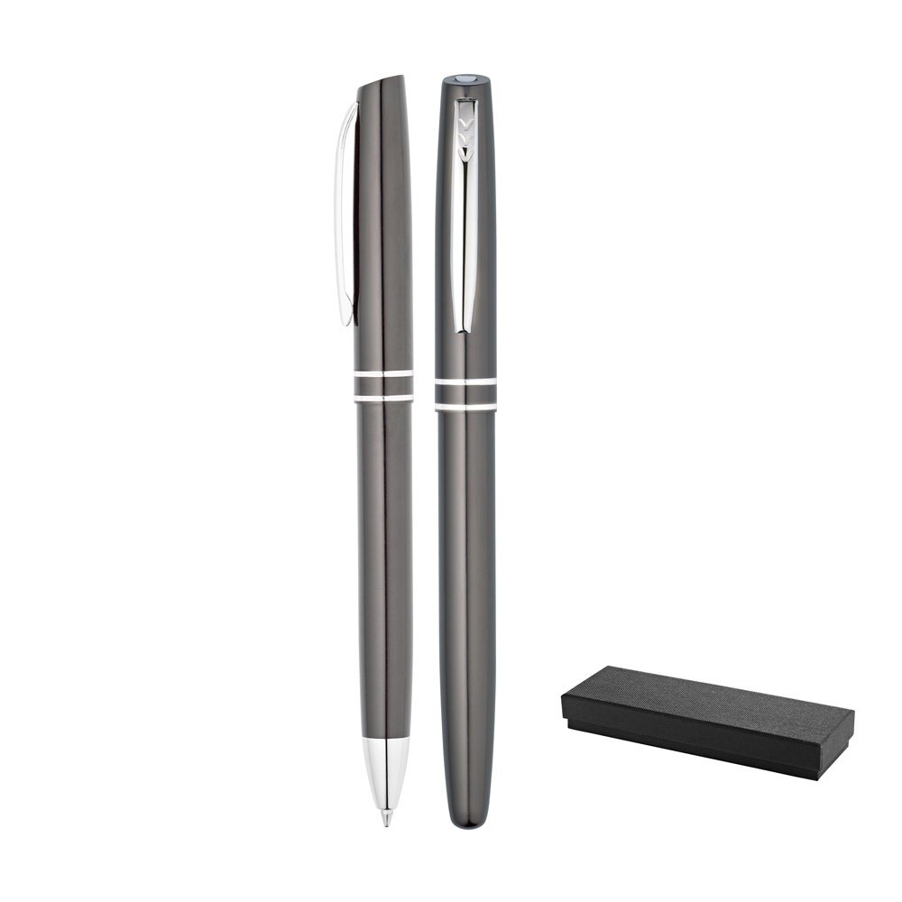 Σετ από στυλό με ρολό και σφαιρίδιο από αλουμίνιο, και τα δύο με κλιπ. Μπλε μελάνι. Παραδίδεται σε παραγεμισμένο κουτί δώρου. ø11 x 138 mm | Θήκη: 175 x 55 x 25 mm