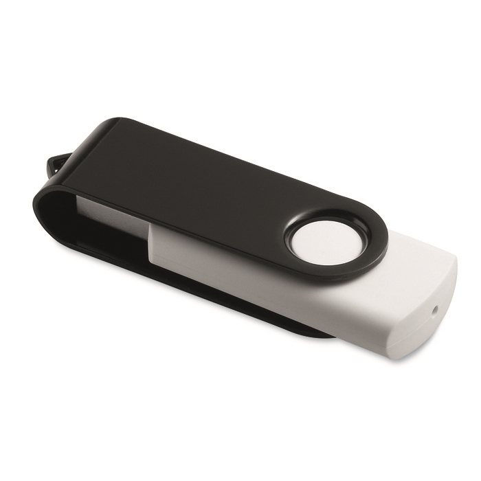 Memory stick με λευκό μαλακό περίβλημα και χρωματιστό μεταλλικό περιστρεφόμενο κάλυμμα.