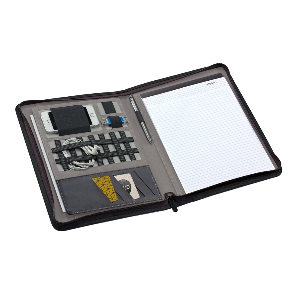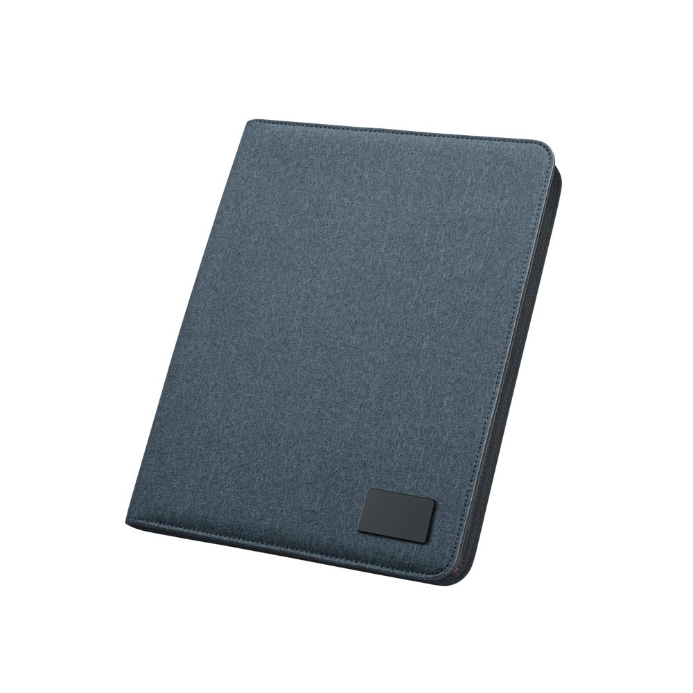 Φάκελος Α4 σε απομίμηση λινού και απομίμηση δέρματος. Αυτός ο φάκελος περιέχει, στο εξωτερικό, μια μεταλλικό ταμπελάκι με rubber φινίρισμα. Μέσα περιέχει ένα σημειωματαριο (20 φύλλα με γραμμές), στήριγμα για ένα στυλό (δεν περιλαμβάνεται το στυλό) και θηκες για αξεσουαρ (δεν περιλαμβάνονται τα αξεσουάρ).259 x 336 x 27 mm | Ταμπελάκι: 50 x 30 mm