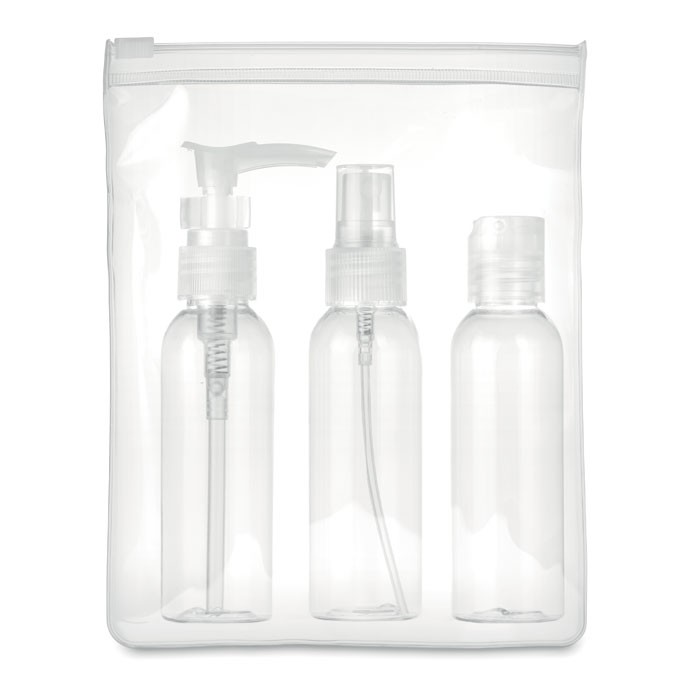 Σετ ταξιδιού σε θήκη. Περιλαμβάνει 3 άδεια PP μπουκάλια σε ξεχωριστή διάφανη θήκη. Χωρητικότητας 60 ml ανά μπουκάλι.