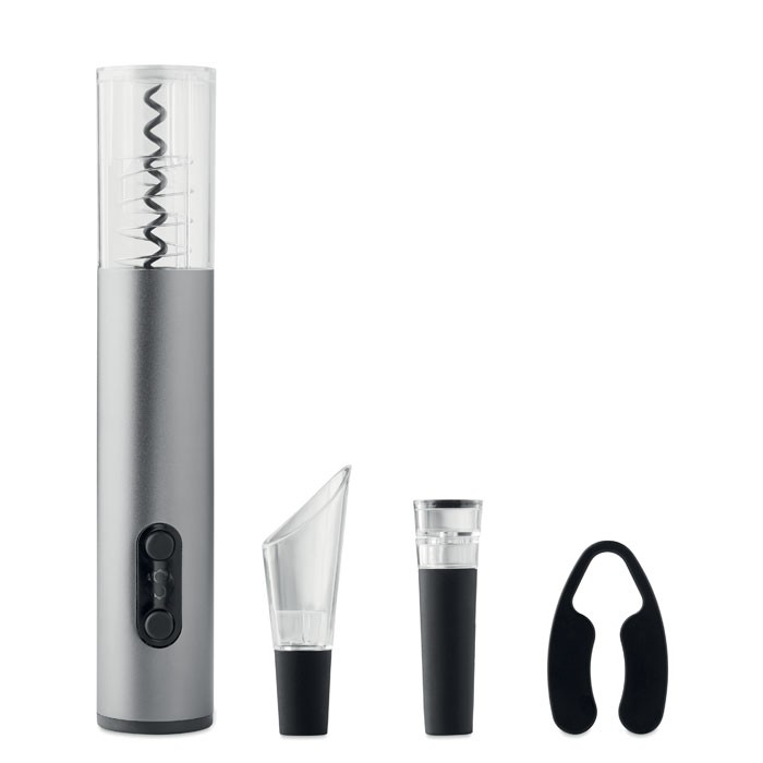 Σετ κρασιού που παρουσιάζονται σε ένα κουτί δώρου. Με πώμα κρασιού, στόμιο ρύθμισης ροής, κόπτη αλουμινίου και ηλεκτρικό ανοιχτήρι μπουκαλιών. Δεν περιλαμβάνονται 4 μπαταρίες AA.